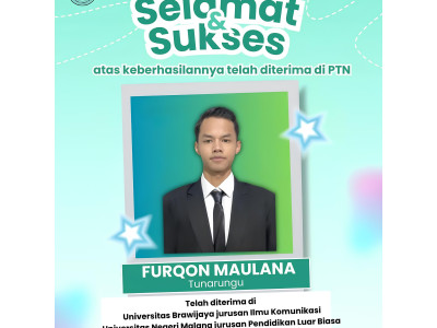 Selamat dan Sukses kami ucapkan kepada Furqon Maulana yang telah diterima 2 PTN, yaitu:Universitas Brawijaya dengan jurusan Ilmu Komunikasi (S1)Universitas