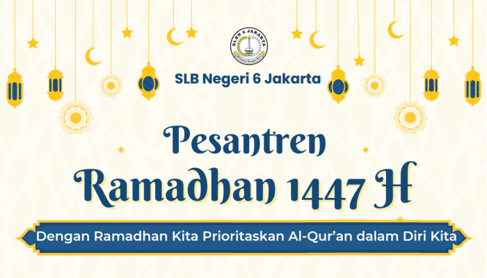 SLB Negeri 6 Jakarta memulai kegiatan Pesantren Ramadhan 1447 H pada Rabu, 11 Maret 2026. Kegiatan ini diikuti oleh seluruh murid dari jenjang SDLB, SMPLB, dan SMALB dengan pendampingan dari para guru.