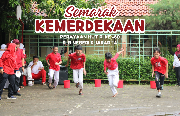 Dalam Rangka Memperingati HUT Kemerdekaan Republik Indonesia ke-80 Tahun, SLB Negeri 6 Jakarta mengadakan lomba 17-an yang diikuti oleh Peserta Didik SLB Negeri 6 Jakarta jenjang SDLB, SMPLB, SMALB, Guru, dan Tendik. Berikut beberapa dokumentasi dari perayaan tersebut :
