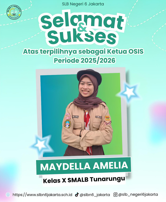 Dalam Masa Pengenalan Lingkungan Sekolah (MPLS) ,SLB Negeri 6 melakukan pemilihan Ketua OSIS Periode 2025 yang di ikuti oleh 7 orang calon ketua OSIS. Pemilihan tersebut di menangkan oleh Maydella Amelia kelas X SMALB Tunarungu.